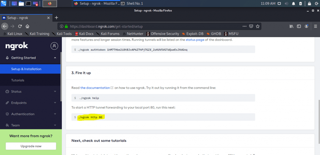 - Then get back to the browser once again and copy the command (./ngrok http 80) under fire it up.