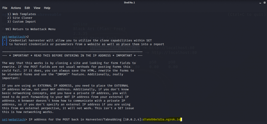 - You will now be able to set to webattack, it will ask you for a post back address where it will send credentials after harvesting. Just get back to your other terminal where you started the ngrok server and copy any of the forwarding addresses.