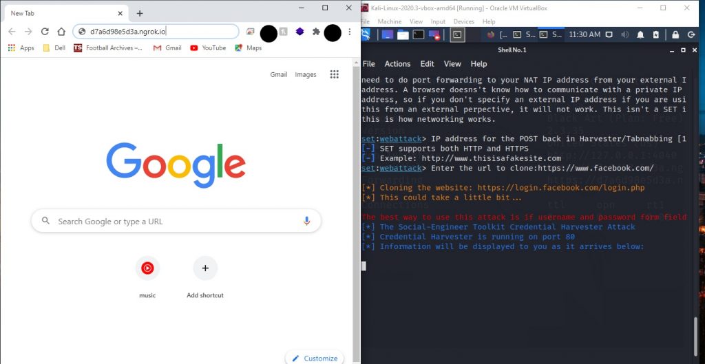 - It’s time to start gathering credentials. You can copy the ngrok address that we used as post back address and share that to your victim but you should not at all use this to harm someone or steal credentials. It is just for educational purpose. I will test this on my google browser on windows machine to show how process goes on when you share this address to someone. You can follow the same steps open your chrome and paste the address and enter.