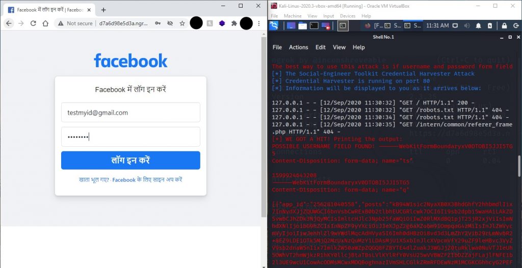 - You can see that our kali recognize that someone just connected to the address. Now I’ll put some random credentials and check it. So I am putting testmyid@gmail.com as email and test1234 as password and press login. As soon as you or the victim press login his or her credentials will be sent our server and the victim will be redirected to error or real fb login page.